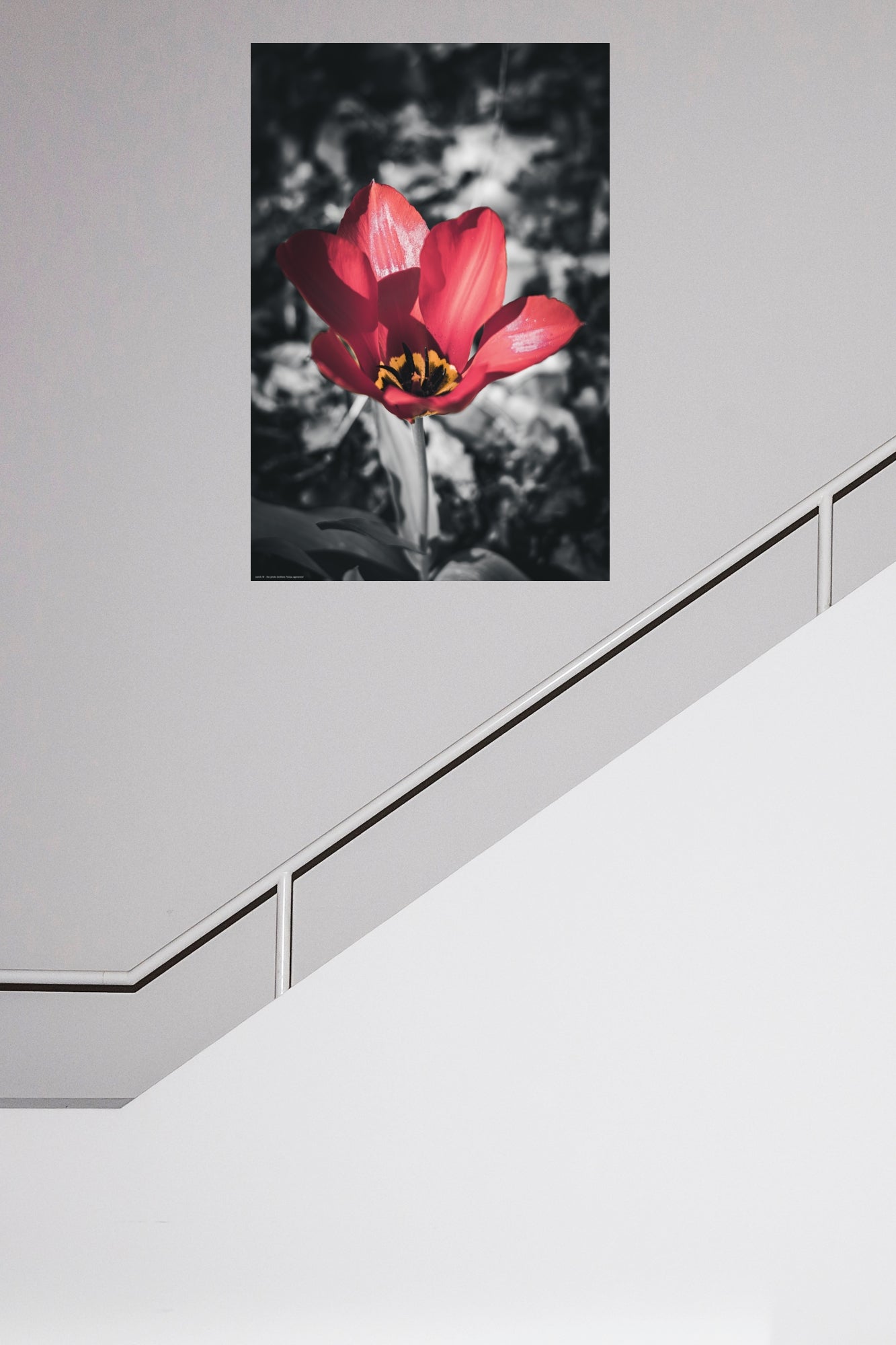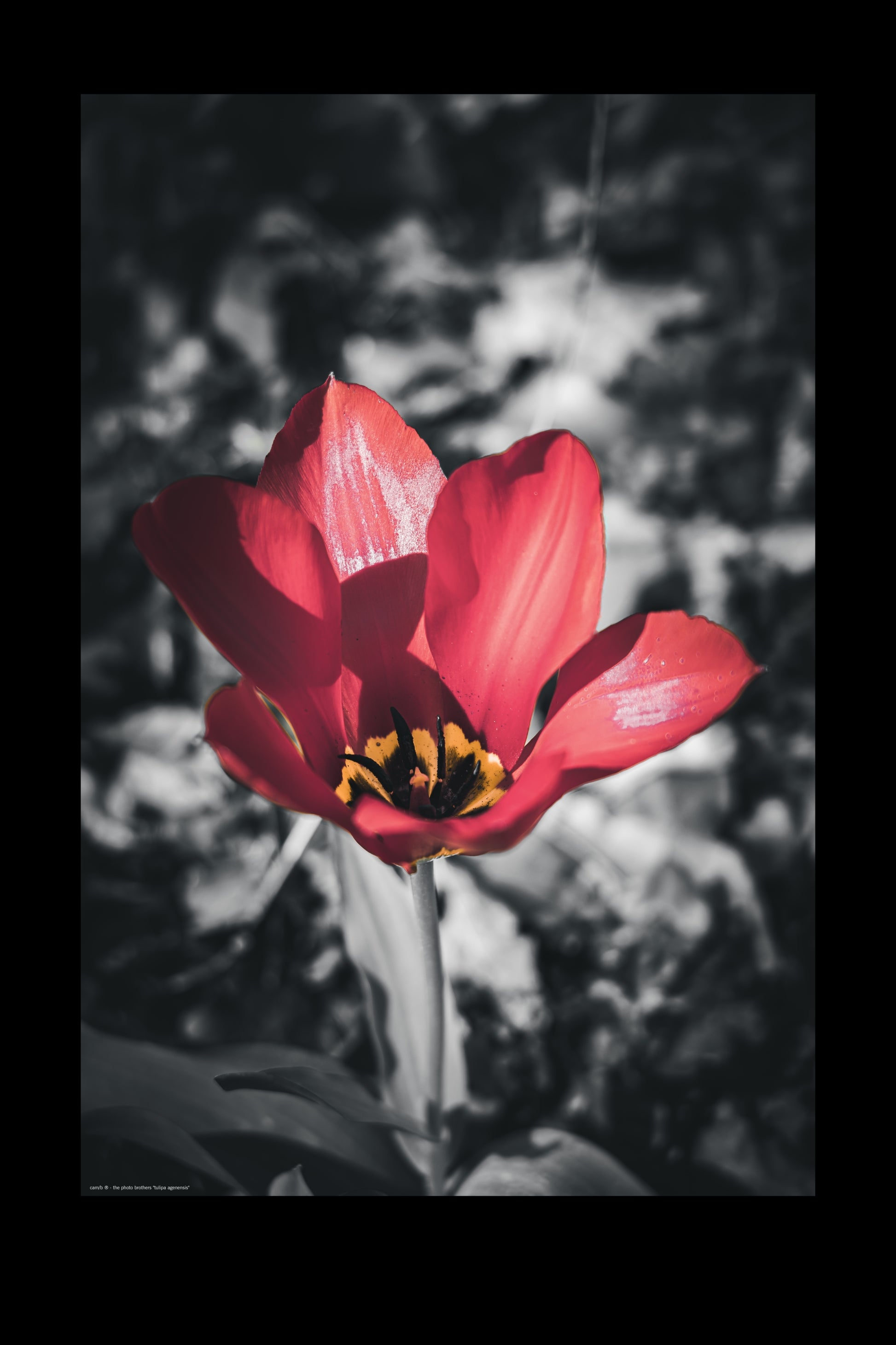 Leuchtend rote Kreuztulpe im April in einem schönen S/W Edit. Überwiegend findet sich diese im mittleren Osten (Fotograf: DE, 2024).