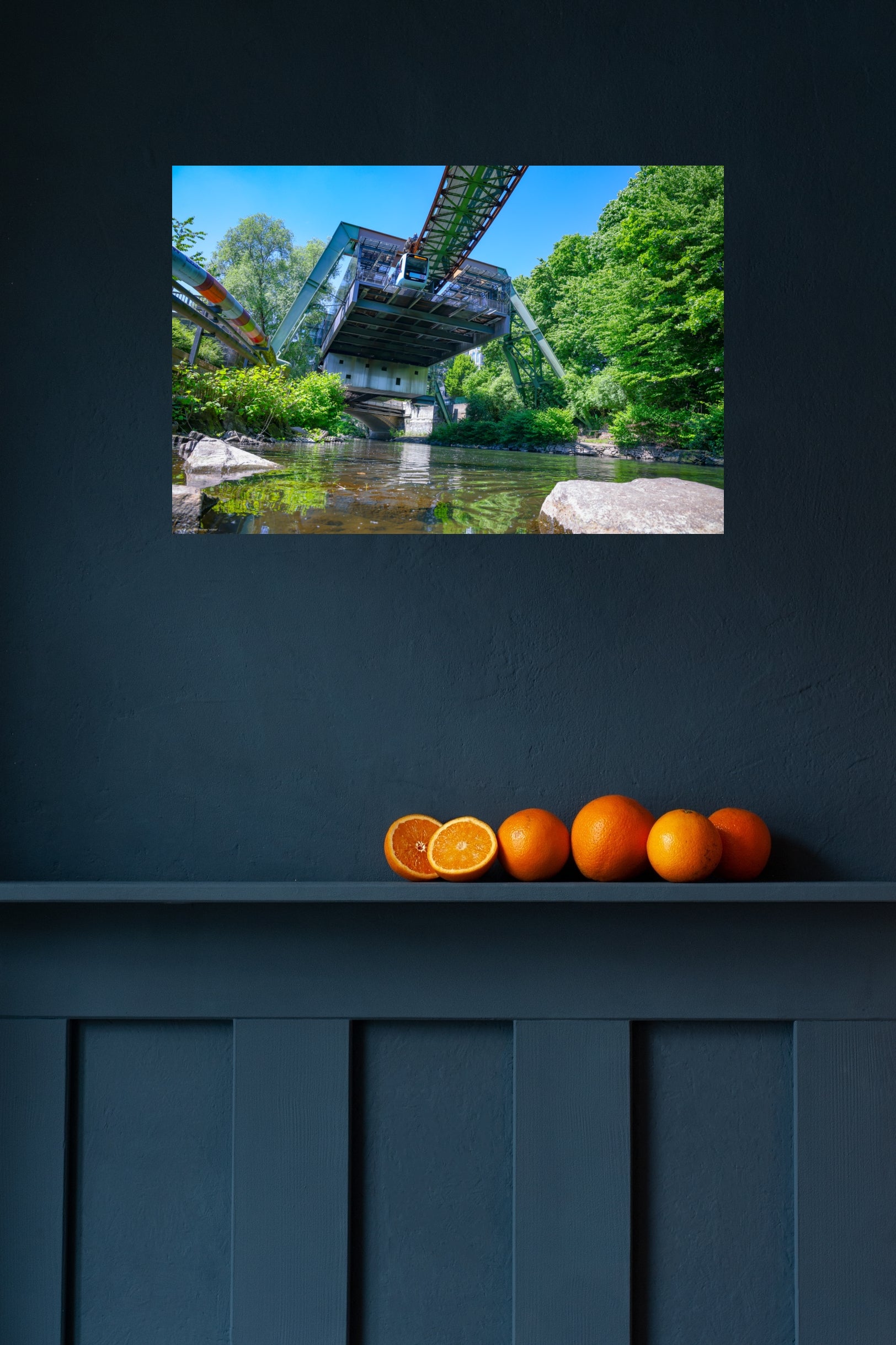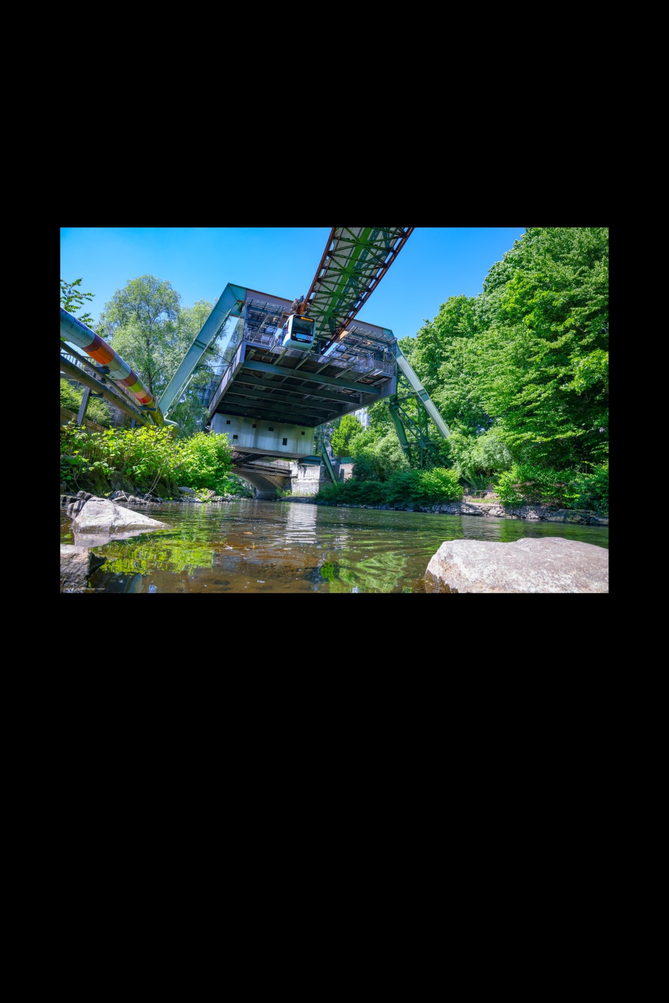 Schönes farbenfrohes Wandbild der Wuppertaler Schwebebahn bei der Ausfahrt aus der Station Loher Brücke, auf der linken Seite Versorgungsleitungen der Wuppertaler Stadtwerke (WSW). Dieses ist typisch für Wuppertal und findet sich fast entlang der gesamten Strecke der Schwebebahn (Fotograf: DE, 2025).