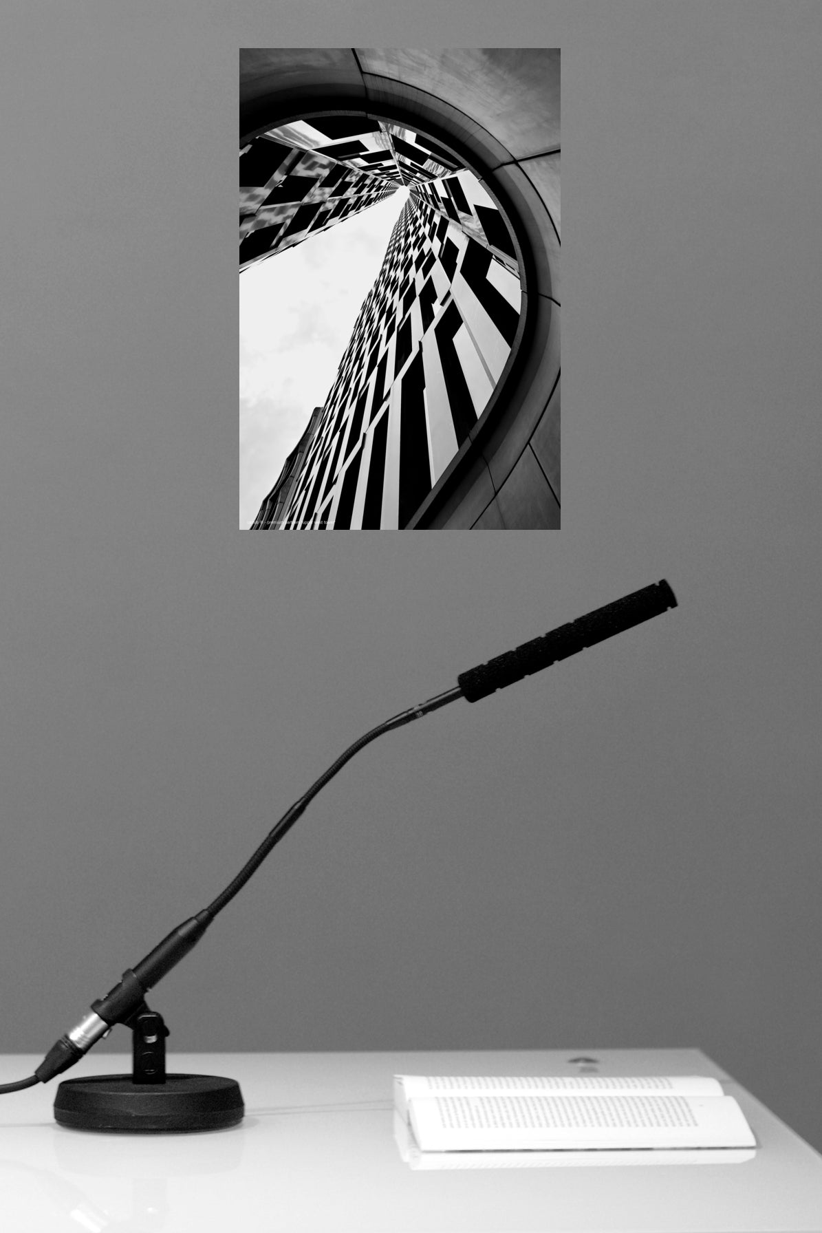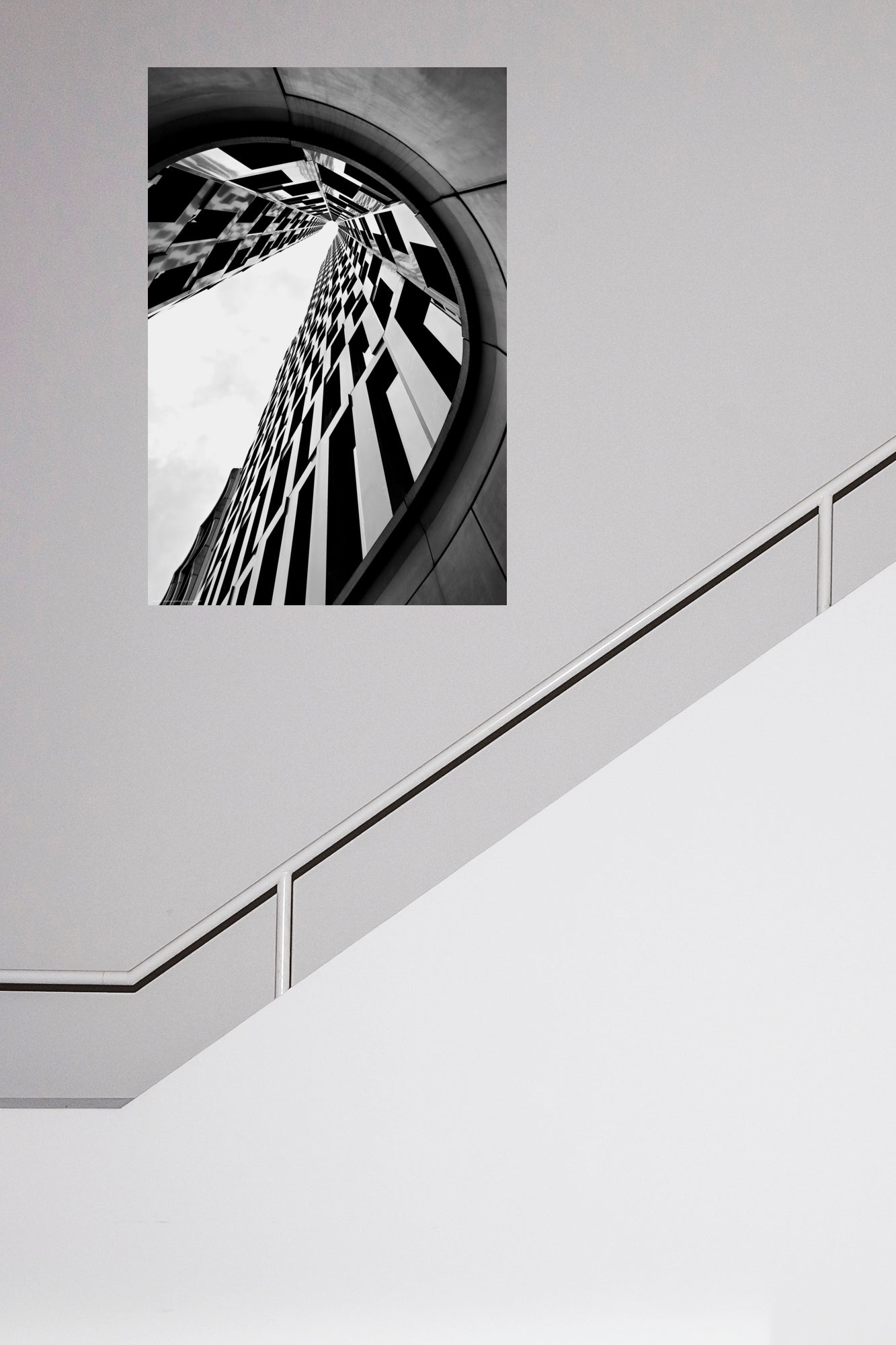 Der Upper West Tower in Berlin gehört mit 118,8 Metern und 33 Etagen zu einem der höchsten Gebäude der Hauptstadt. Diese beeindruckende s/w Fotografie besticht durch ihre minimalistische Symetrie die scheinbar bis in die Unendlichkeit reicht (Fotograf: Manuel Heywinkel, 2025).