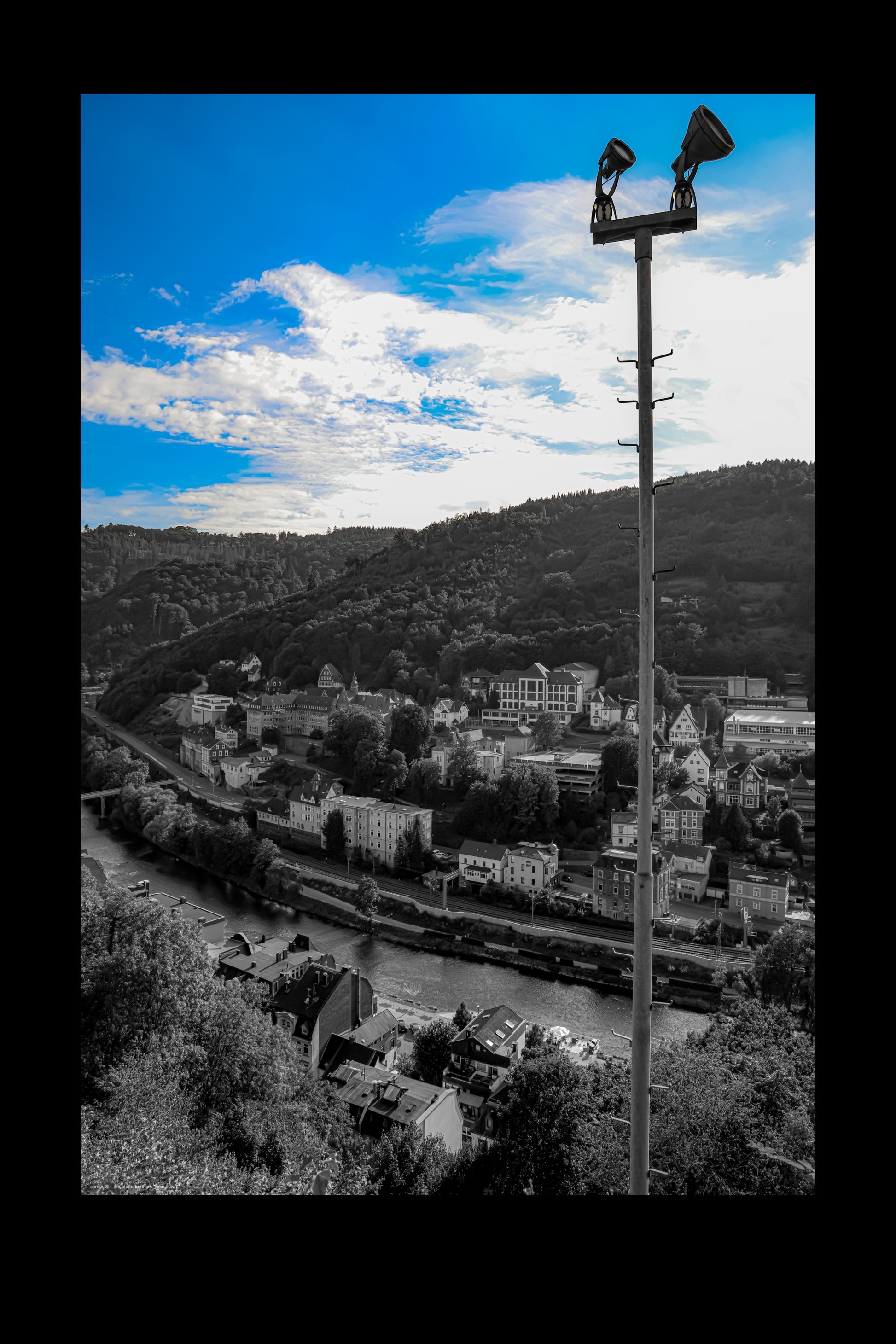 Blick ins Tal bei strahlend blauen Himmel auf die Stadt Altena in einem schönen Farbedit (Fotograf: DE, 2022).