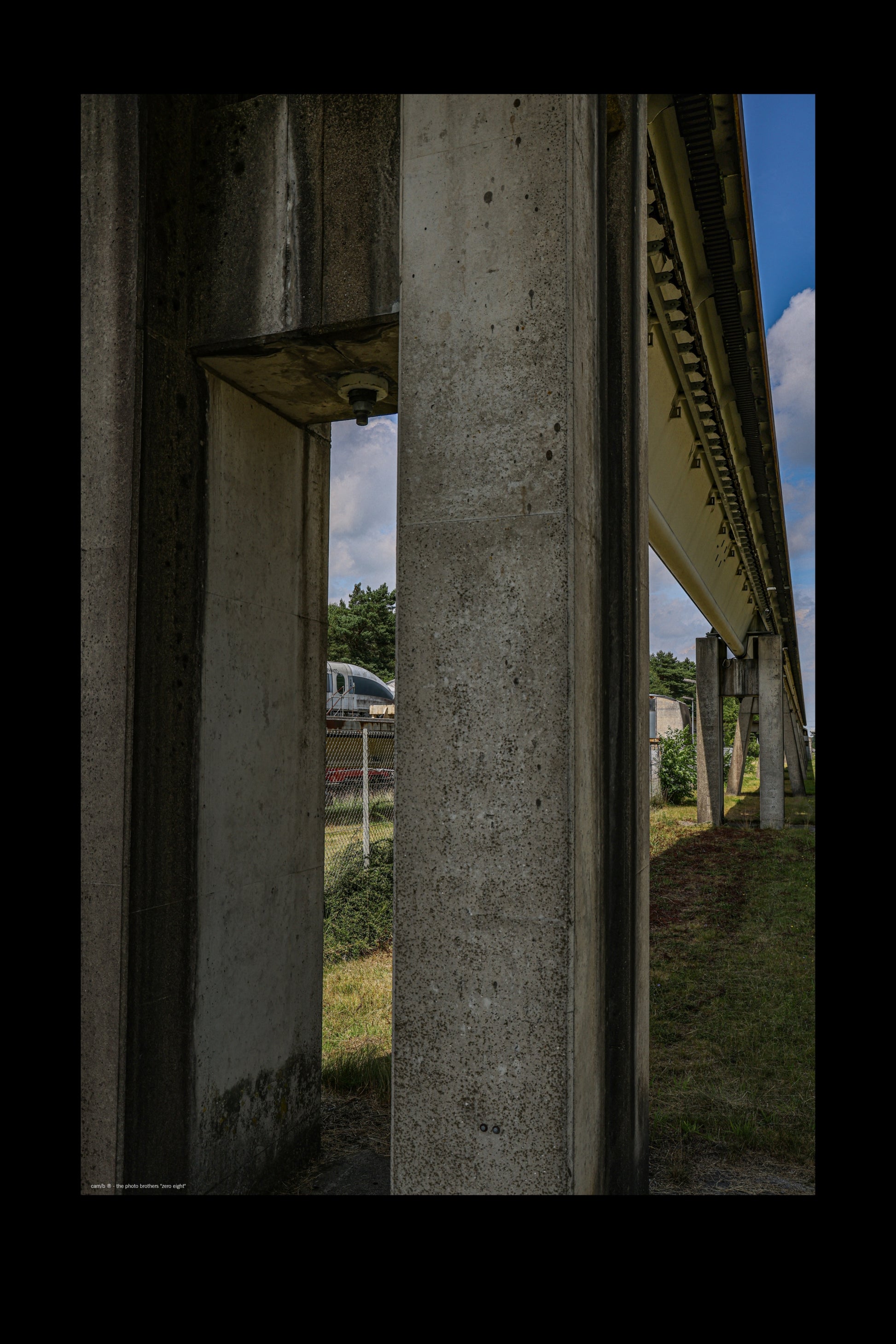 Dieses Bild zeigt die Transrapid Trasse auf dem ehemaligen Testgelände im Emsland, Zwischen den Trägern ist der TR 08 zu erkennen, die Magnetschwebebahn war für bis zu 550 km/h ausgelegt (Fotograf: DE, 2022).